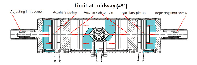 As shown above, the midway position of three position double acting actuator of 90° or 180° is achieved by a mechanical stops from 2 auxiliary pistons and adjusting limit screws. Firstly, air to port D forces the auxiliary pistons inwards and than stop in the midway under the restriction of the adjusting limit screw. The screw is external and adjustable. Second, air to port 4 forces the main pistons outwards, causing the pinion to turn clockwise which will be stopped under the restriction of the auxiliary piston bar in midway.
