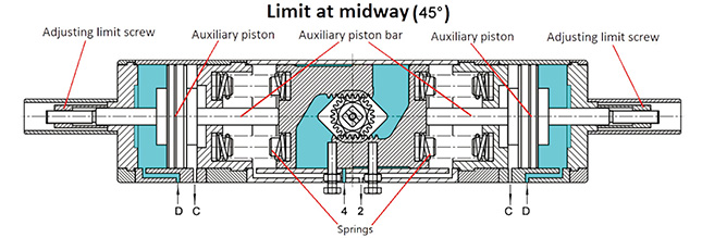 As shown above, the midway position of three position spring return actuator of 90° is achieved by a mechanical stops from 2 auxiliary pistons and adjusting limit screws. Firstly, air to port D forces the auxiliary pistons inwards and than stop in the midway under the restriction of the adjusting limit screw. The screw is external and adjustable. Second, air to port 4 forces the main pistons compression springs and outwards, causing the pinion to turn clockwise which will be stopped under the restriction of the auxiliary piston bar in midway.