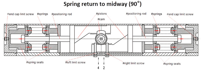 2.3.3 When loss of air pressure on ports 2 and 4, the stored energy in the springs forces the pistons moving and the pinion turn and stop to 90° position under the joint action of the spring seats and the positioning rod. The end cap limit screw can slightly adjust the output torque at 90°.