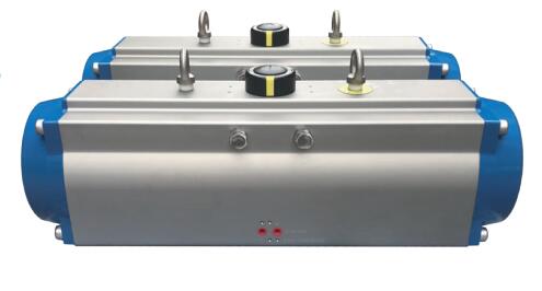 The three-position actuator is mainly used for the process control of three-way or four way valve or other three-position rotating device. We can provide two types of three-position pneumatic actuators. one is 90° three-position actuator of double acting and spring return which can perform stroke operation in three positions within the range of 90°, such as 0°, midway(MD) and 90°, MD = (20°, 80°), and the other one is 180° three-position actuator of double acting and spring return which can perform stroke operation in three positions within the range of 180°, such as 0°, midway and 180°, MD = (90°, 170°). However as for spring return actuator, MD=90°.