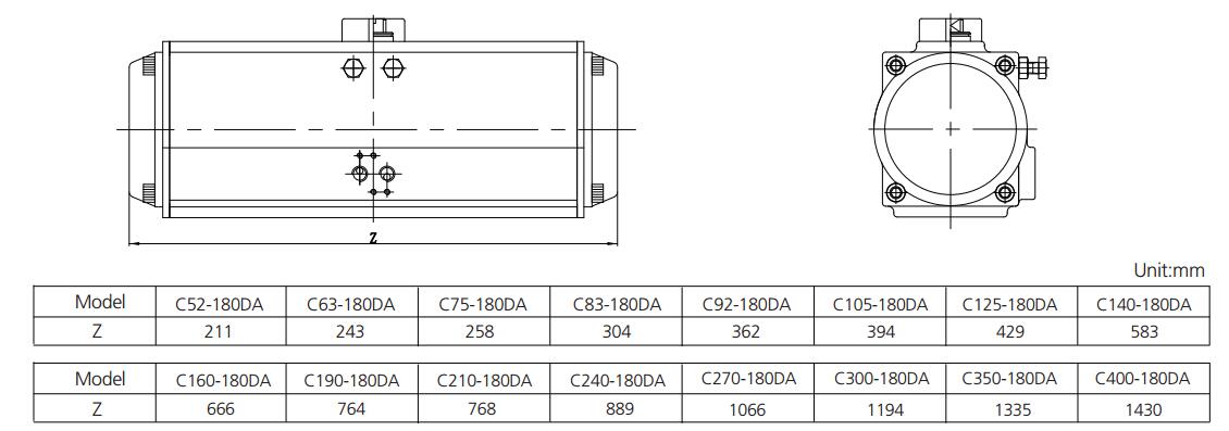 standard actuator of 90°. The following figure shows the external dimensions of the C-300T-180SR. For the dimension drawing of other models, please contact the sales manager (info@alpha-achem.com).