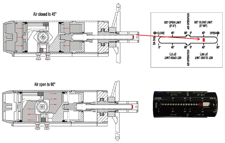 LIMIT zone (see below photo) by the handwheel, and the pneumatic actuator with handwheel can perform 45-90° limit pneumatic operation as follows. For