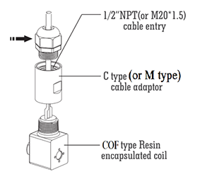 1, This coil consists of two parts, "weather proof structure (cable adaptor)" and thermoplastic encapsulated pull-type solenoid coil (COF type resin encapsulated coil), as shown in the left figure. 2, The cable adaptor and coil are connected by encapsulated threaded installation. It has excellent climate protection performance. 3, The weatherproof cable connector pointed to by the arrow in the left figure is not included in the product configuration. Users need to select and configure it according to their needs. The connection size is 1/2" NPT. 4, After installation correctly in the structure shown in the left figure, the coil's climate protection rating can reach IP67. Main technology data