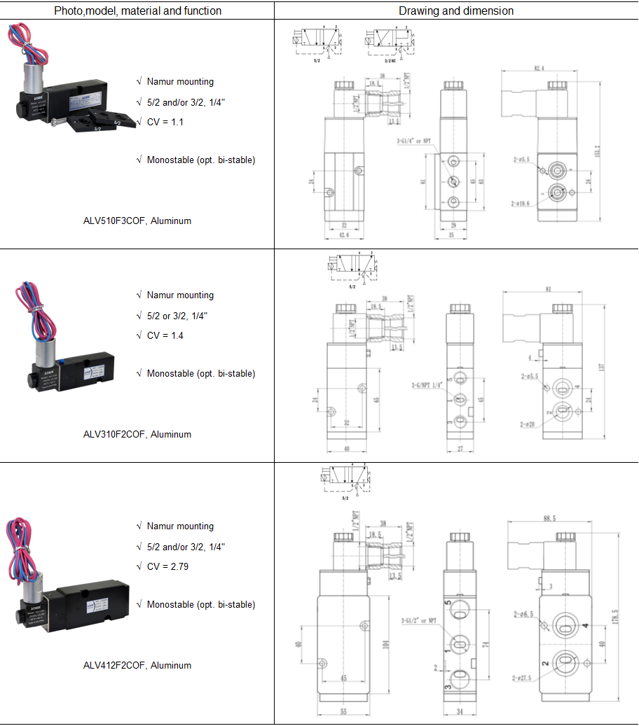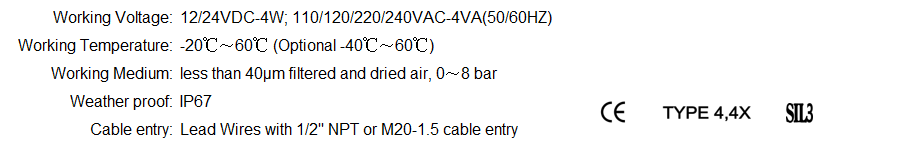 Pilot Acting Solenoid Vavle with Lead Wires Any inquiry, please contact with info@allied-actuator.com About the product This series of products is pilot acting solenoid valve with "weather proof structure" and thermoplastic encapsulated pull-type solenoid coil which can offer excellent environmental protection against the ingress of liquids, dusts or other foreign matter into the coil. This valve is with high performance spool valve available both for 3/2, 5/2 or 5/3, and the CV value is availble to 1.1, 1.4 or 2.79.